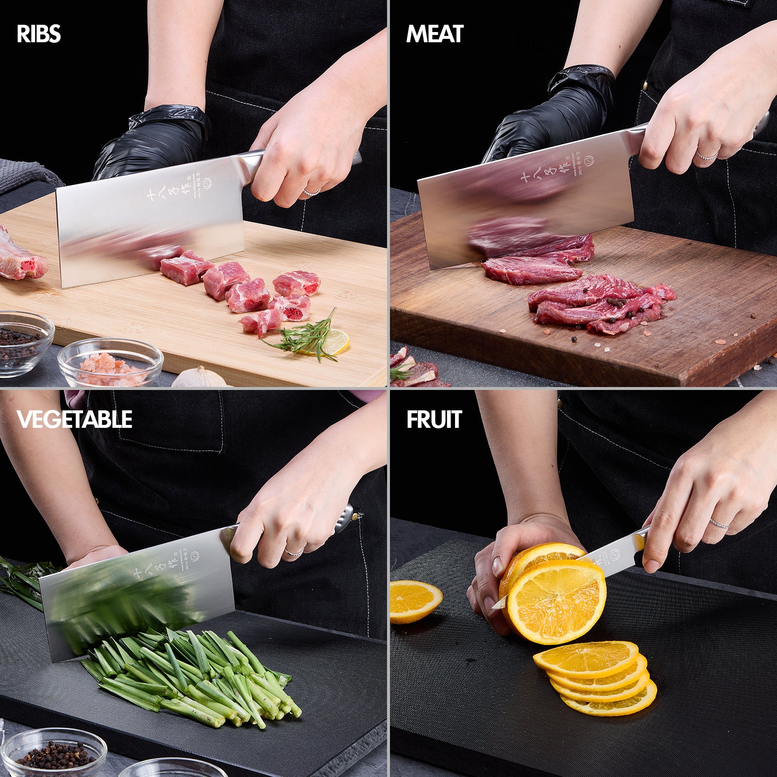 - Professional Knife Set - This kitchen knife set includes 2 razor-sharp knives: a cleaver knife and a fruit knife.Whether you're slicing meat,vegetables,dicing herbs,or prepping fruits, each kitchen knife of this set is designed to handle a variety of tasks effortlessly. Perfect for both professional chefs and home cooking enthusiasts.