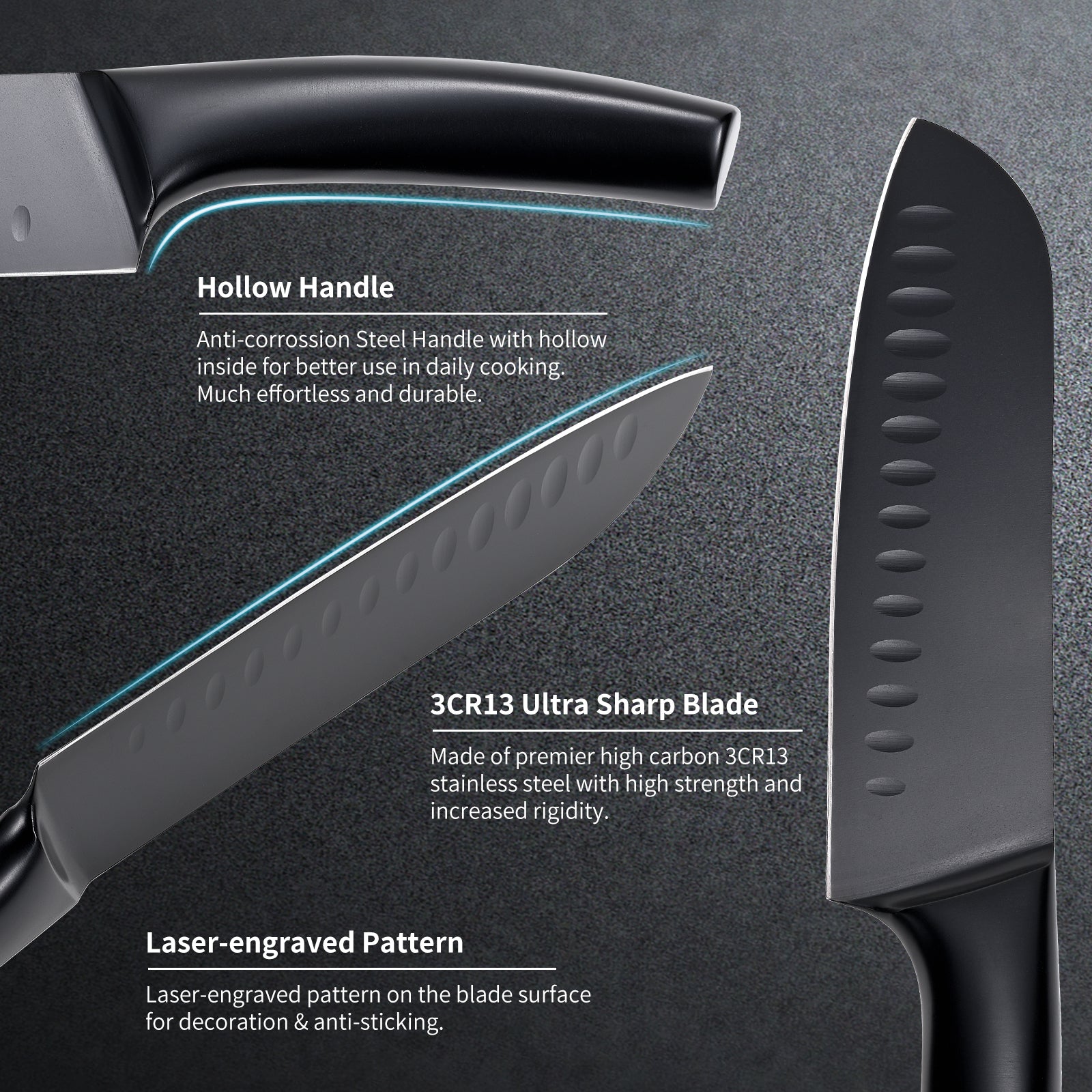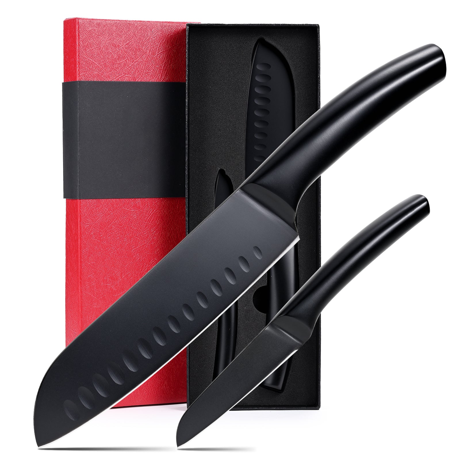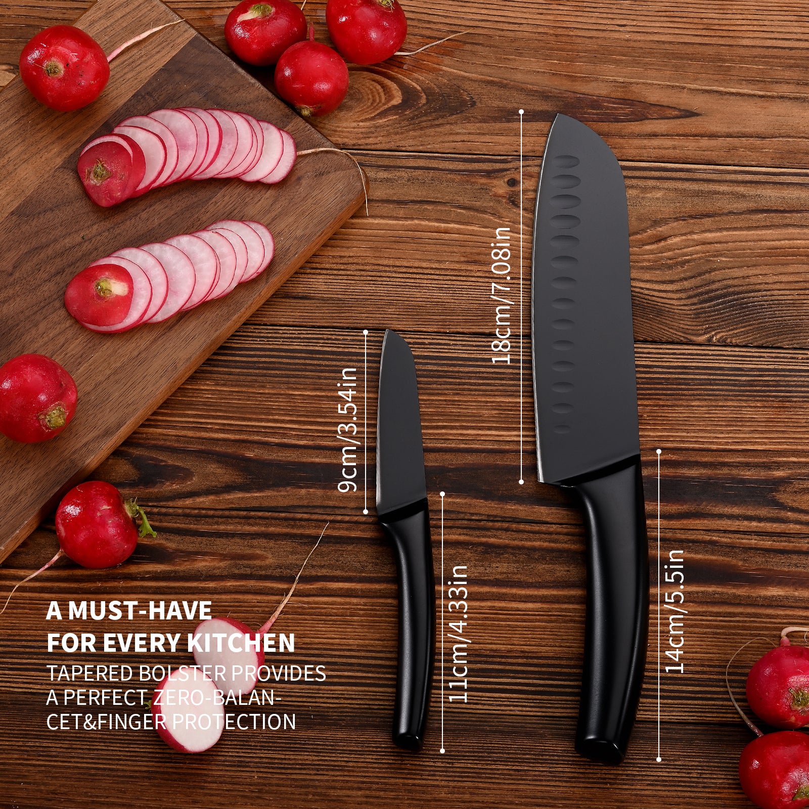 SHI BA ZI ZUO 2 Pieces Kitchen Knife Set,Santoku Knife and Paring Knife,Black Ti Coating Japanese Chef Knife Fruit Knife with Hollow Handle