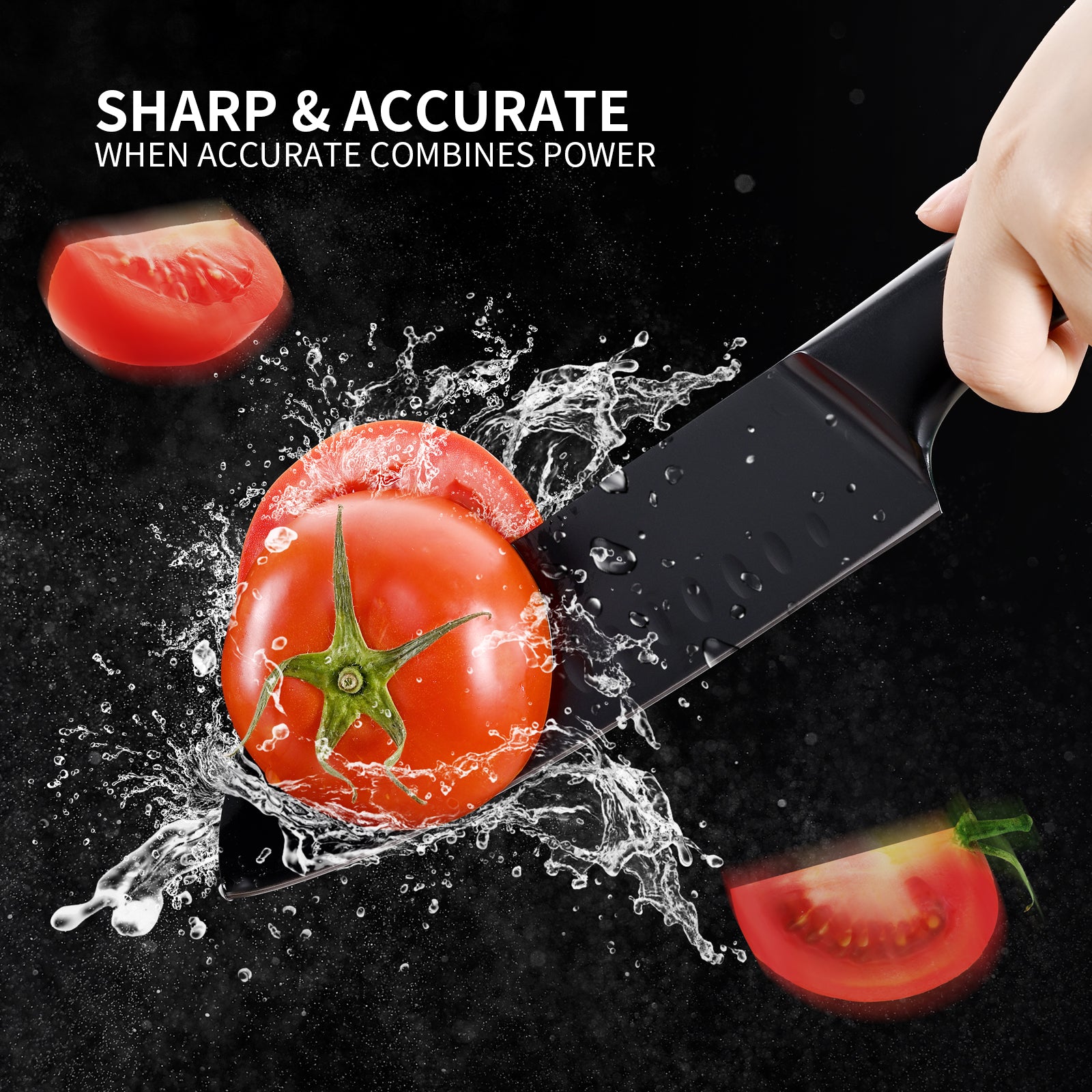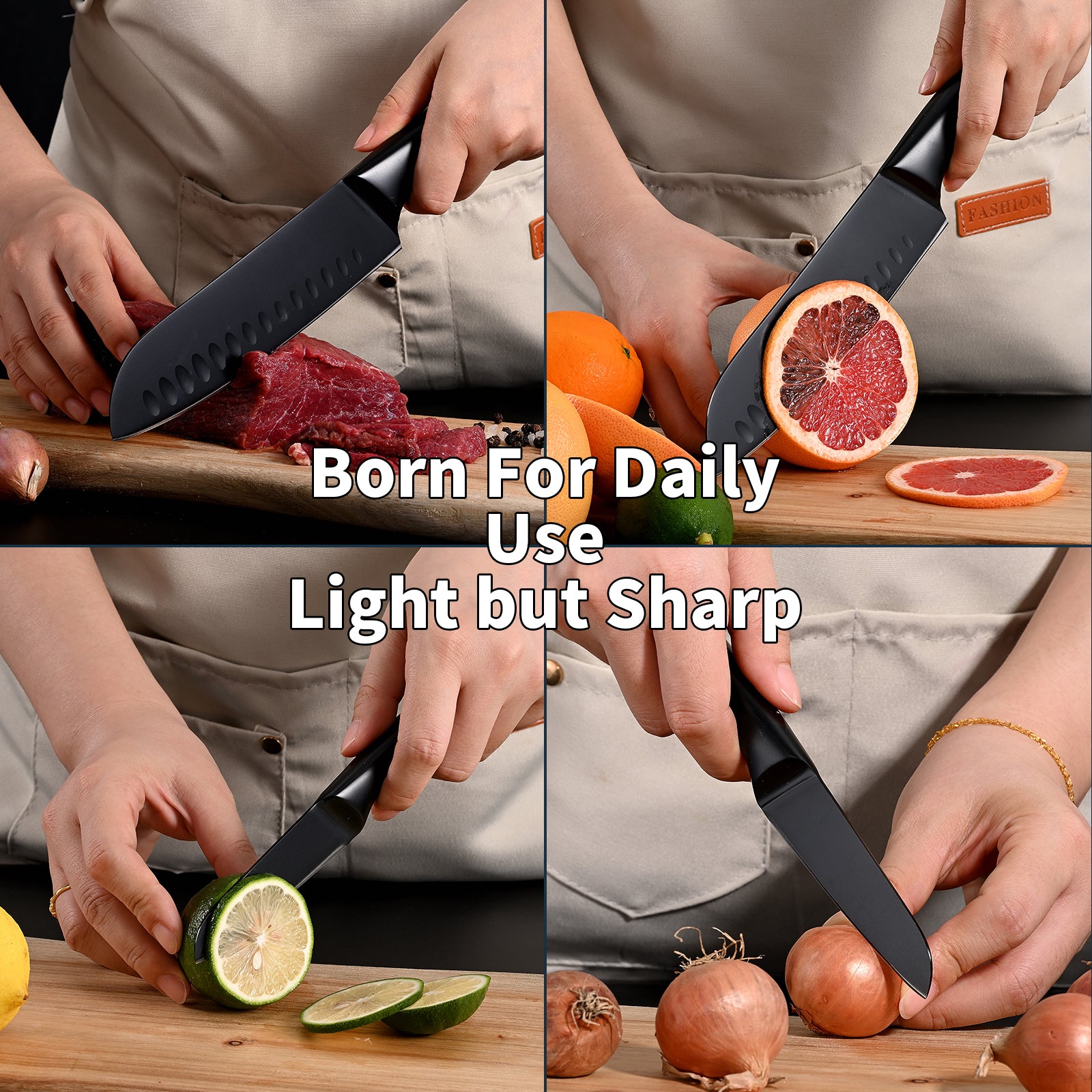- 【Professional Knife Set】This kitchen knife set includes 2 razor-sharp knives: a 7 inches santoku knife, a 5 inches fruit knife.Whether you're slicing meat,vegetables,dicing herbs,or prepping fruits, each kitchen knife of this set is designed to handle a variety of tasks effortlessly. Perfect for both professional chefs and home cooking enthusiasts.