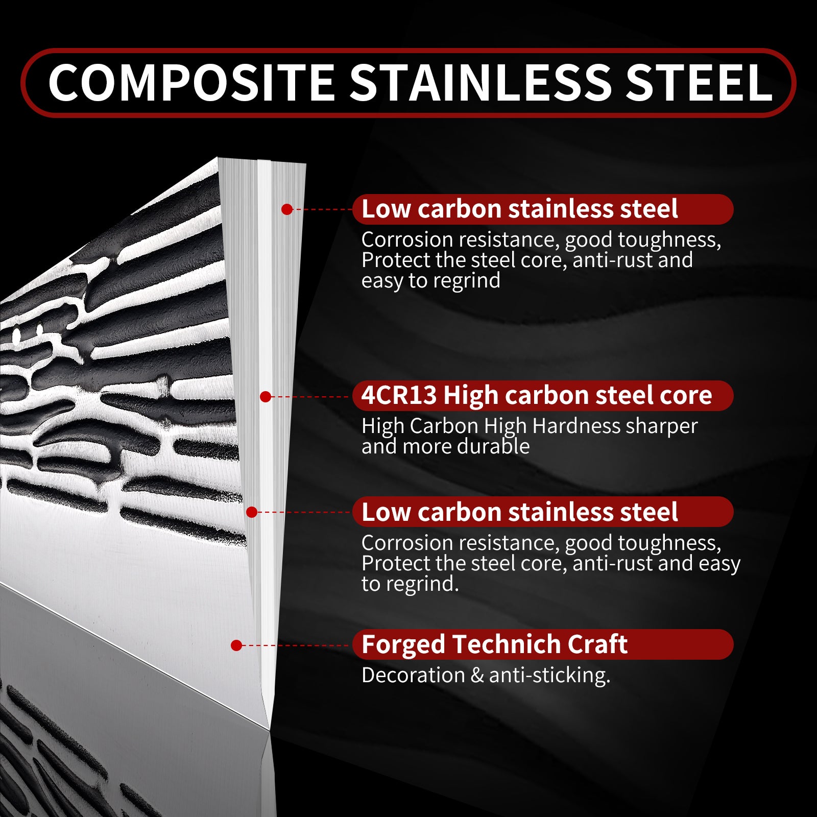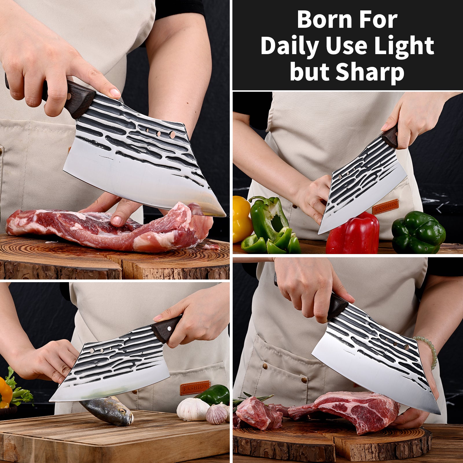 - 【Precise Craftsmanship】These forged chef knives are hand forged by craftsmen with more than 50 years of experience. Our durable knife boasts incredibly sharp blades. The chopping knife can be keeped the blade sharp for a long time, helping you cut food effortlessly. The oxidation blackening and hammering process add an anti-stick effect, enhancing the knife's technical and aesthetic appeal.
