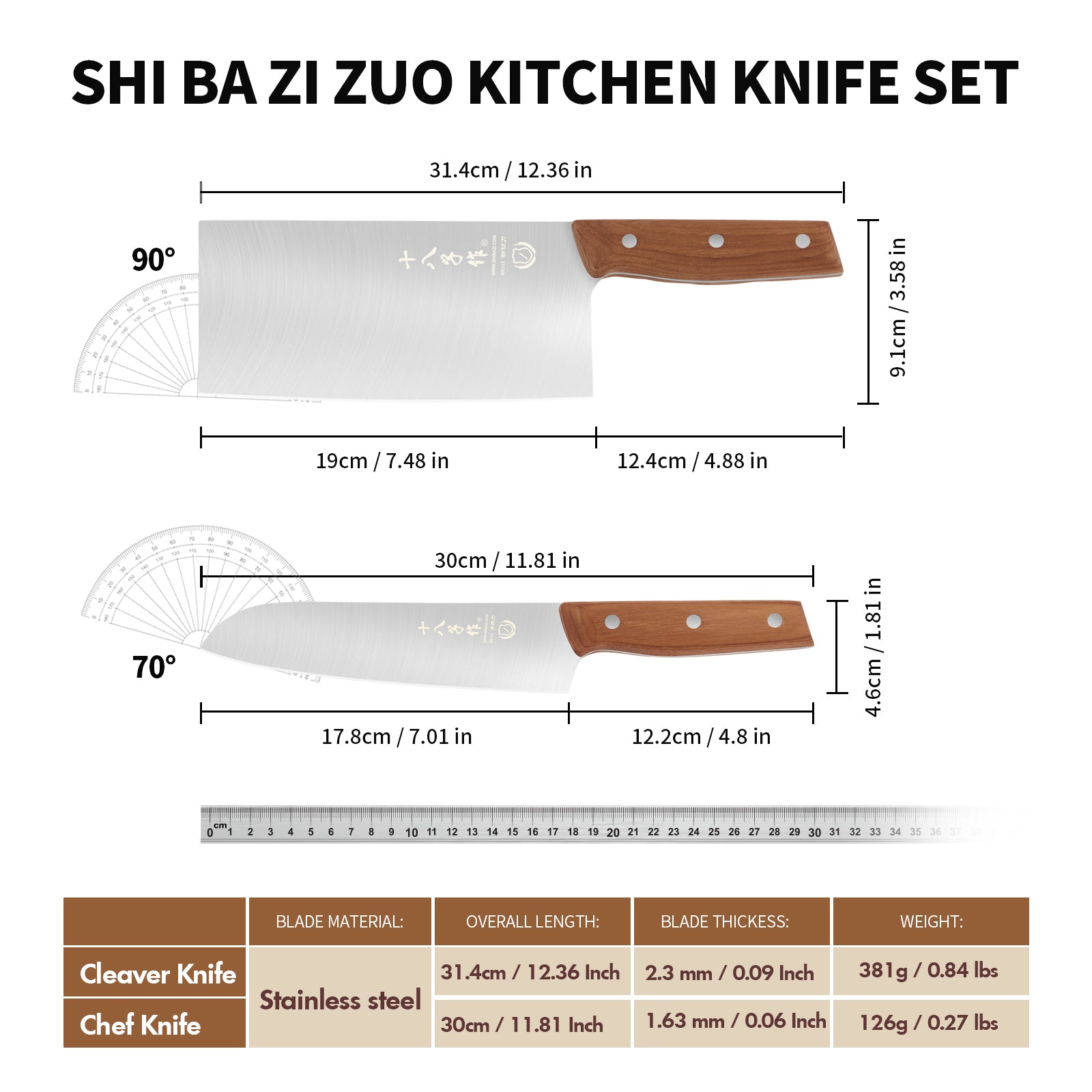 SHI BA ZI ZUO Chinese Kitchen Knife and Santoku Knife,2 PCS Kitchen Knife Set Chef Knife for Cutting Meat and Vegetables,with Ergonomic Design Wooden Handle