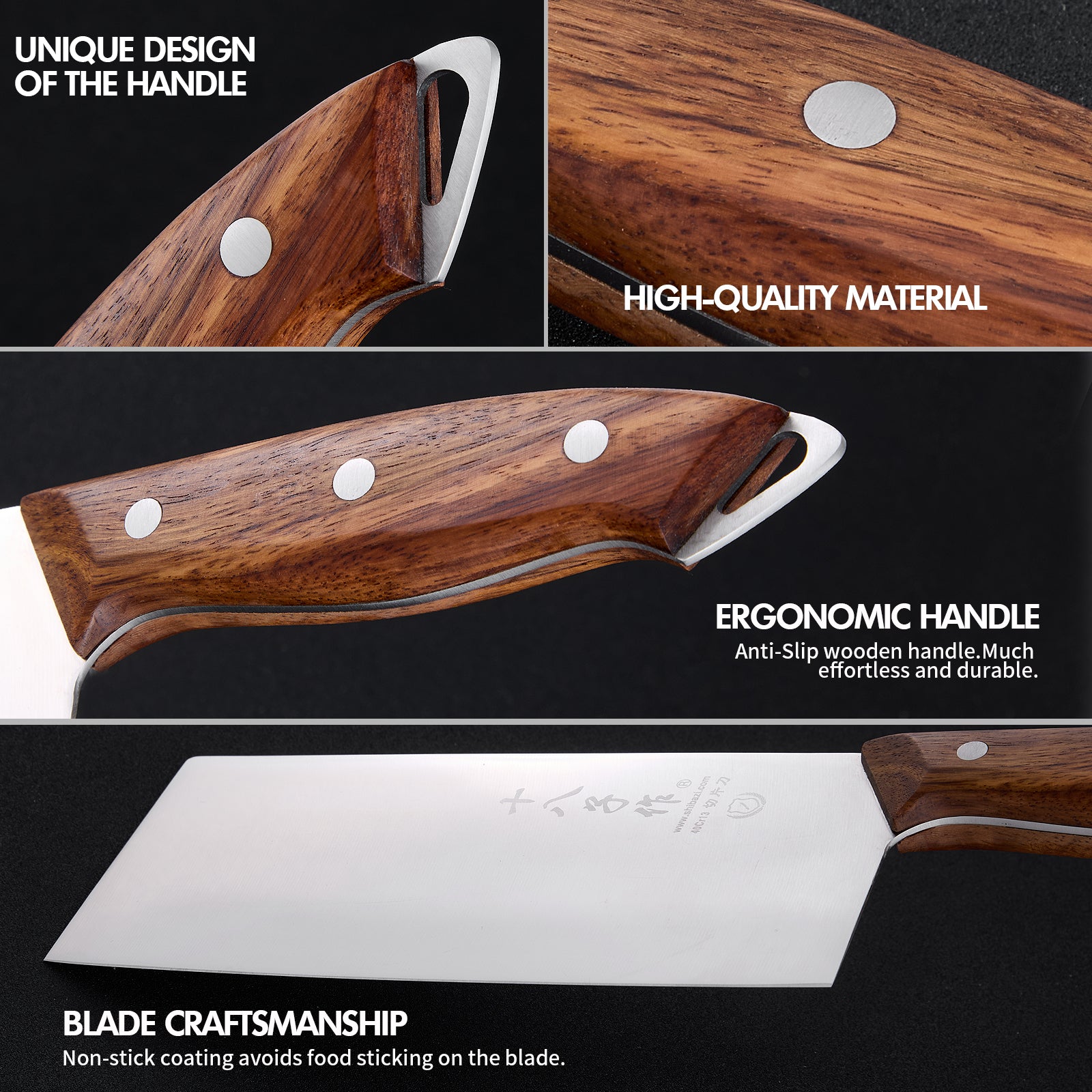 - Blade Craftsmanship - Vacuum heat treatment endows the steel with best mechanical property. Non-stick coating avoids food sticking on the blade. Wire-drawing integrated full tang blade is more stable and safer.