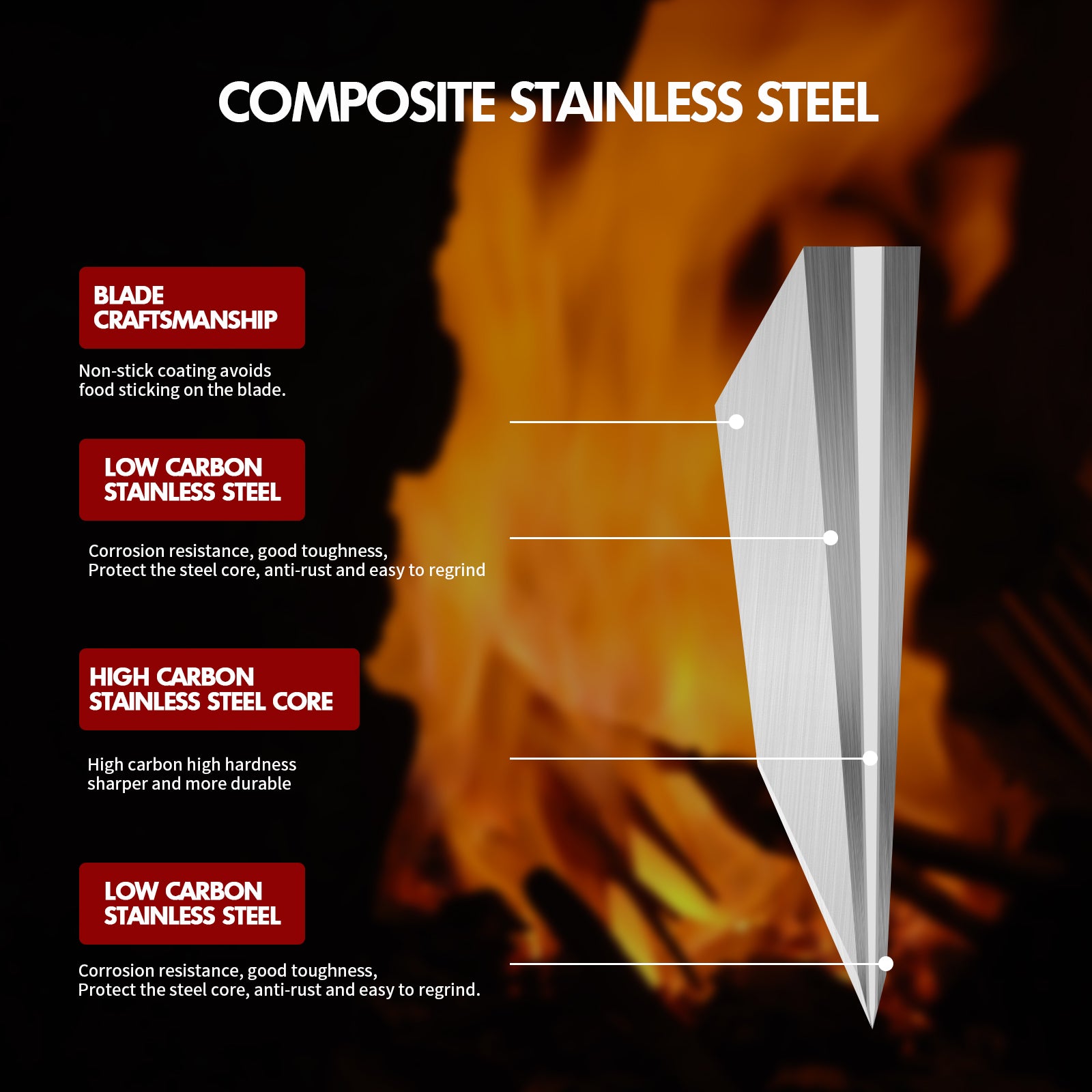 - Premium Stainless steel - 3 layer high quality clad 50Cr15 stainless steel of high carbon core steel performs excellent hardness, durability and sharpness maintaining. Outside layers of low carbon steel does well in toughness, corrosion resistance and plasticity. The combination of two steels makes this Knife perfectly work.