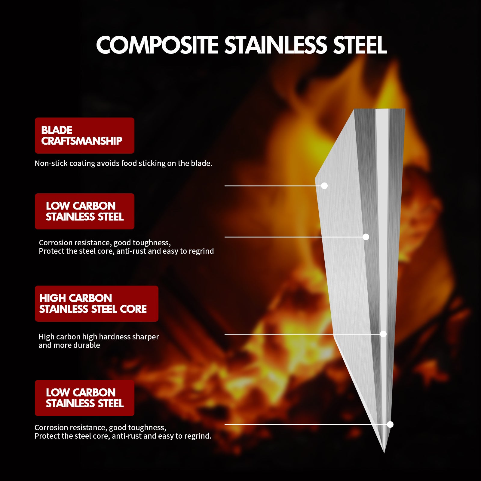 - Premium Stainless steel - 3 layer high quality clad 40Cr13 stainless steel of high carbon core steel performs excellent hardness, durability and sharpness maintaining. Outside layers of low carbon steel does well in toughness, corrosion resistance and plasticity. The combination of two steels makes this Knife perfectly work.
