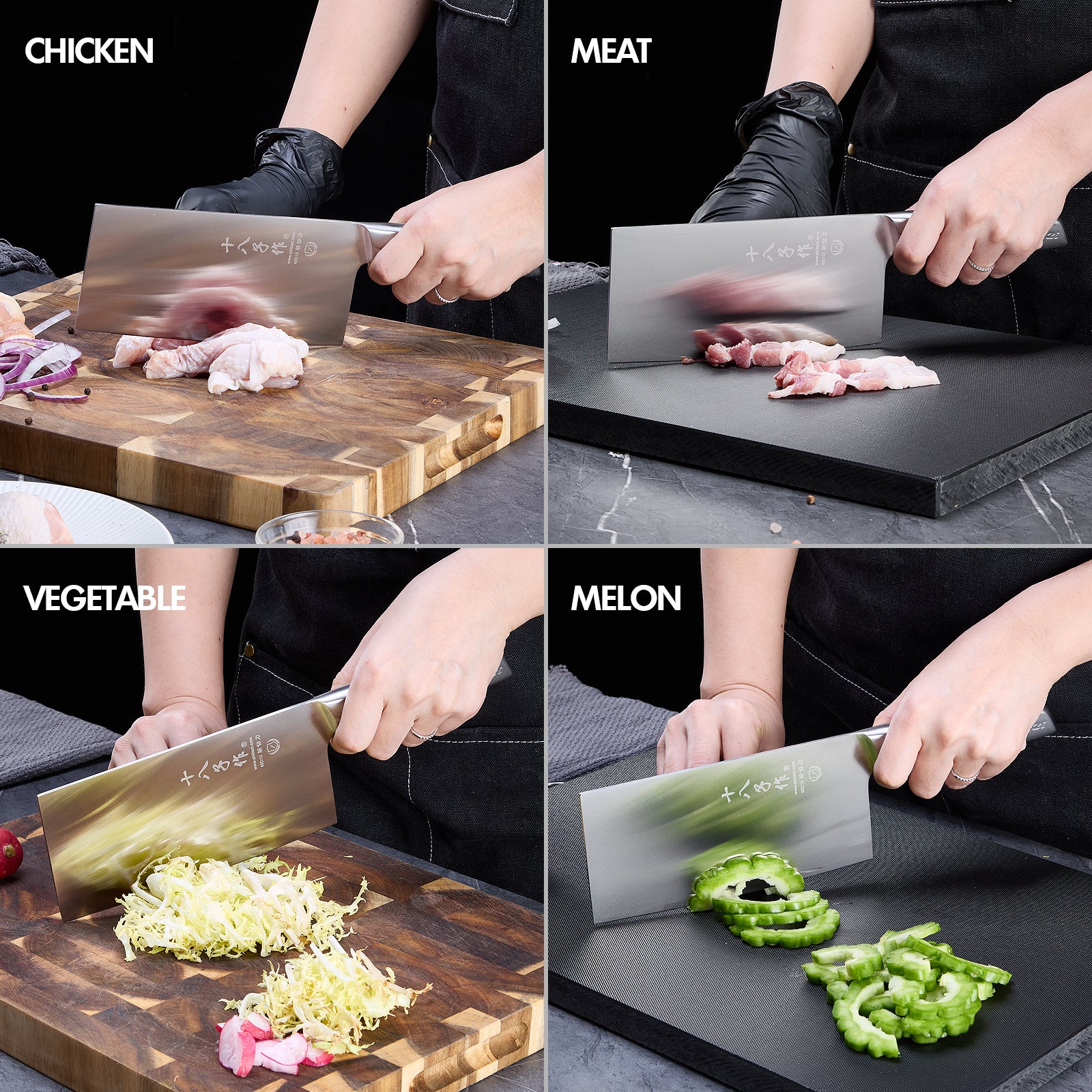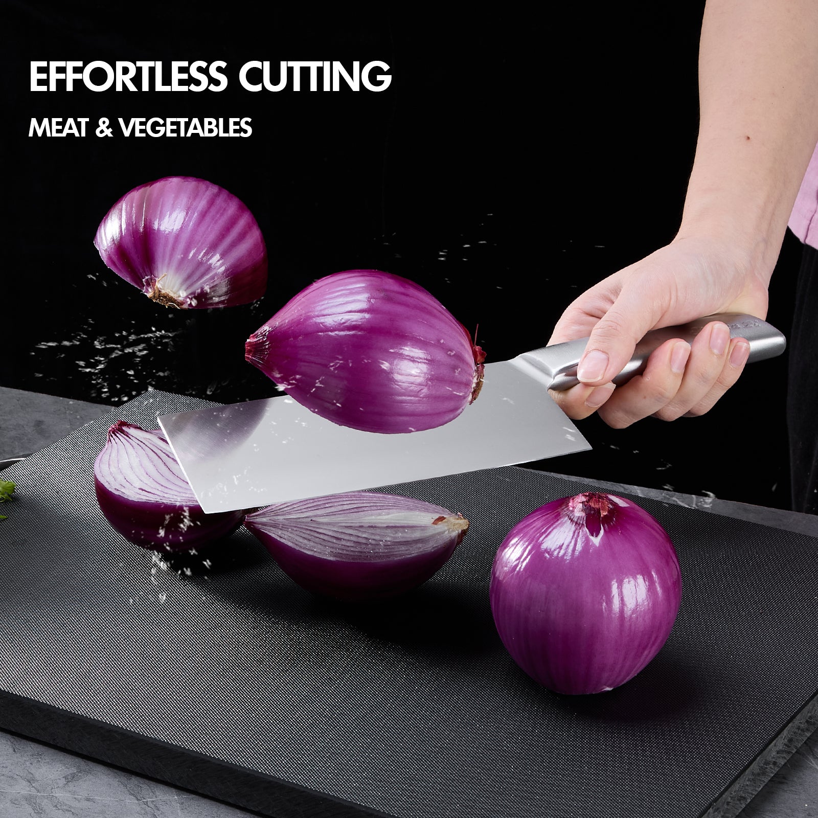 - Full Purpose Cleaver - Ultra sharp blade edge design and well balance of this knife make it perfectly for cutting, slicing, dicing and mincing meat, vegetable. Wide blade is able to smash garlic. It is suitable for homes and restaurants.