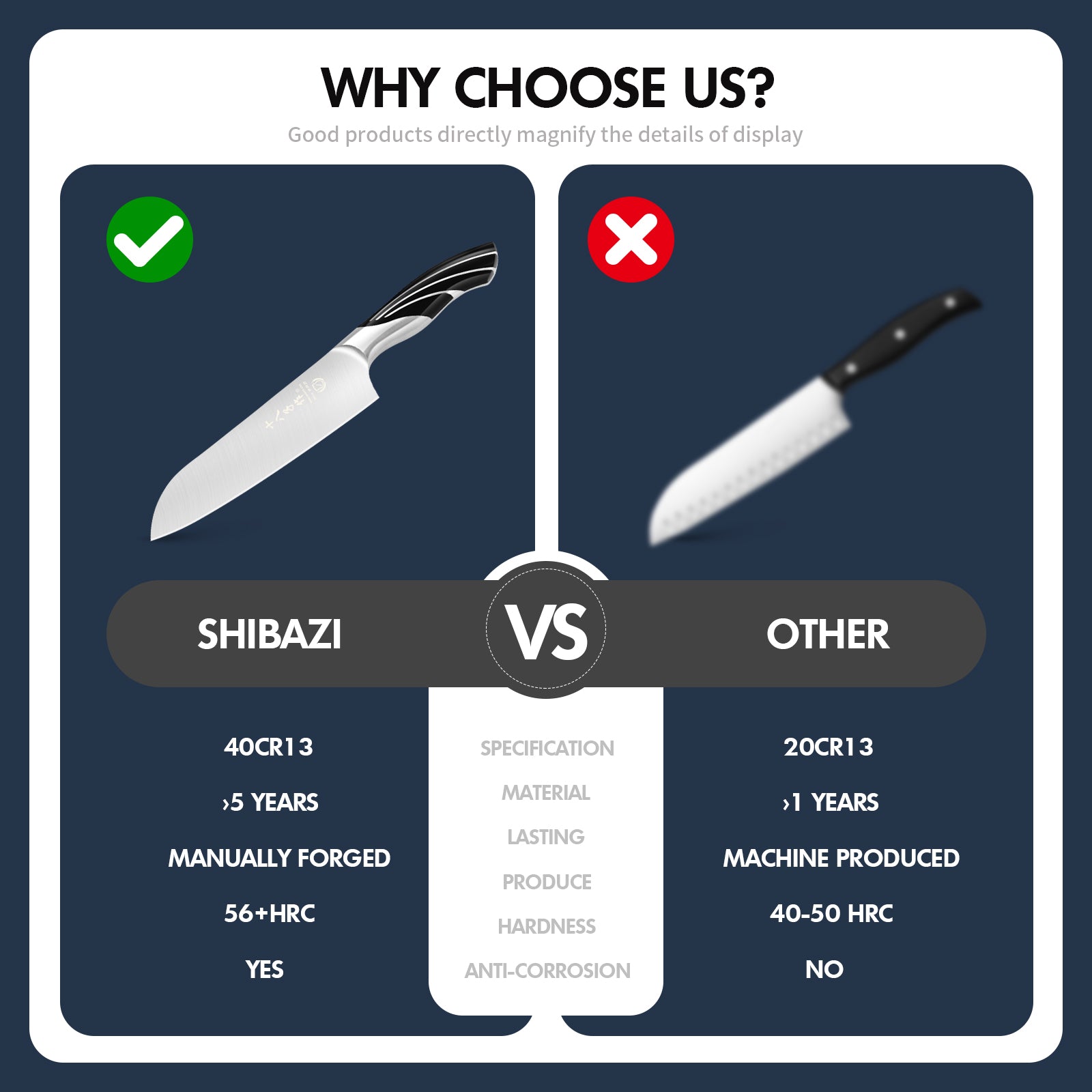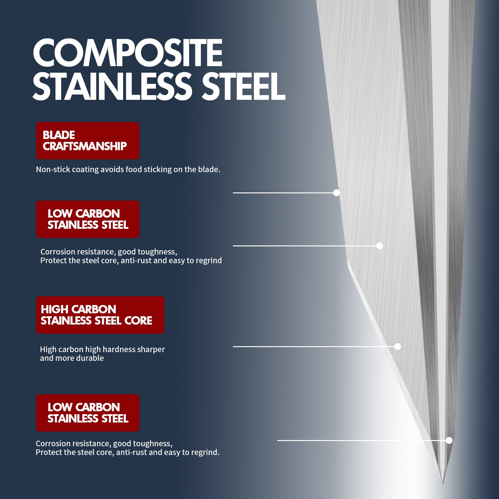 - Premium Stainless steel - 3-layer high quality clad stainless steel. High carbon core steel performs excellent hardness, durability and sharpness maintaining. Outside layers of low carbon steel does well in toughness, corrosion resistance and plasticity. The combination of two steels makes the knife perfectly work.