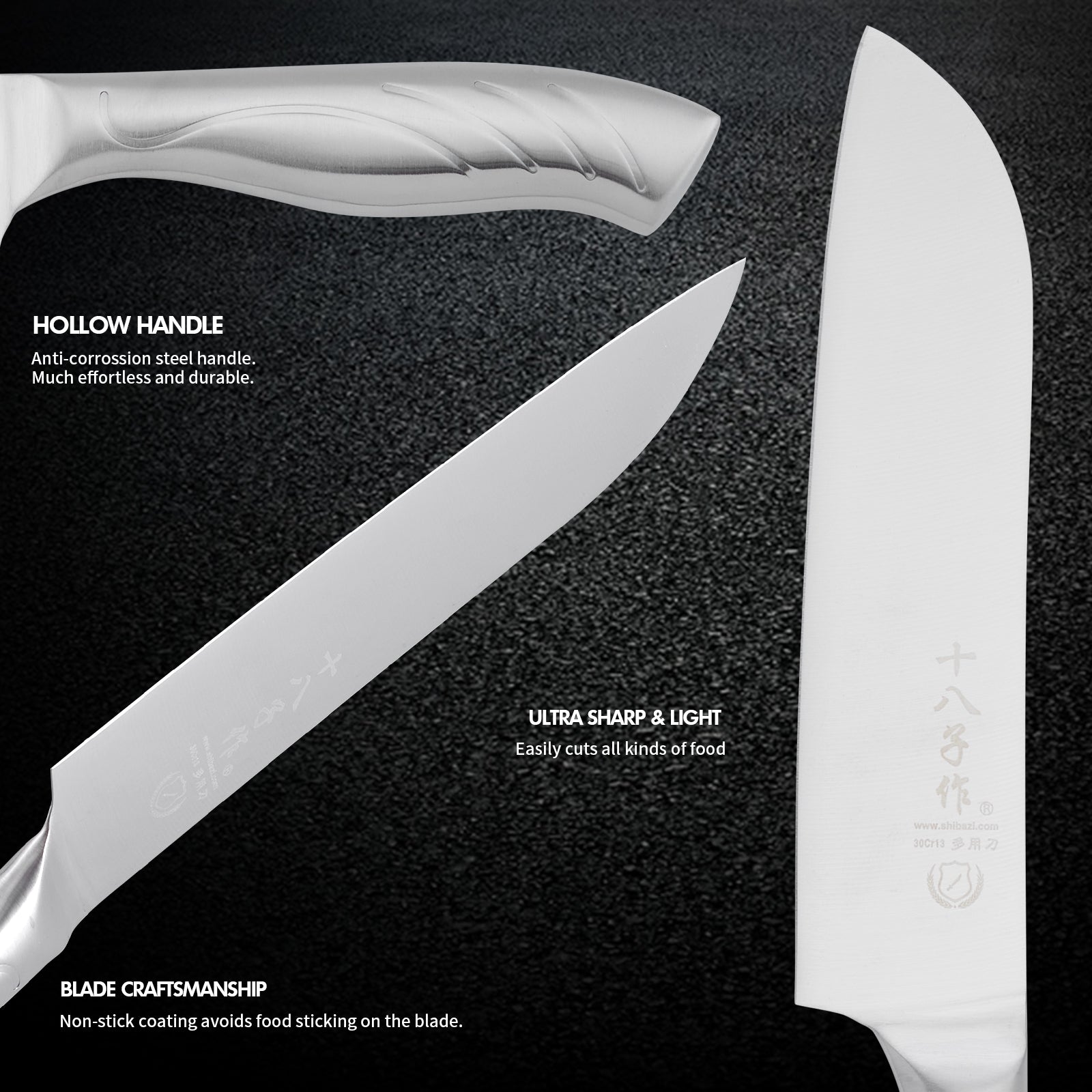 - 【Blade Craftsmanship】Vacuum heat treatment endows the steel with best mechanical property. Non-stick coating avoids food sticking on the blade. Wire-drawing integrated full tang blade is more stable and safer.