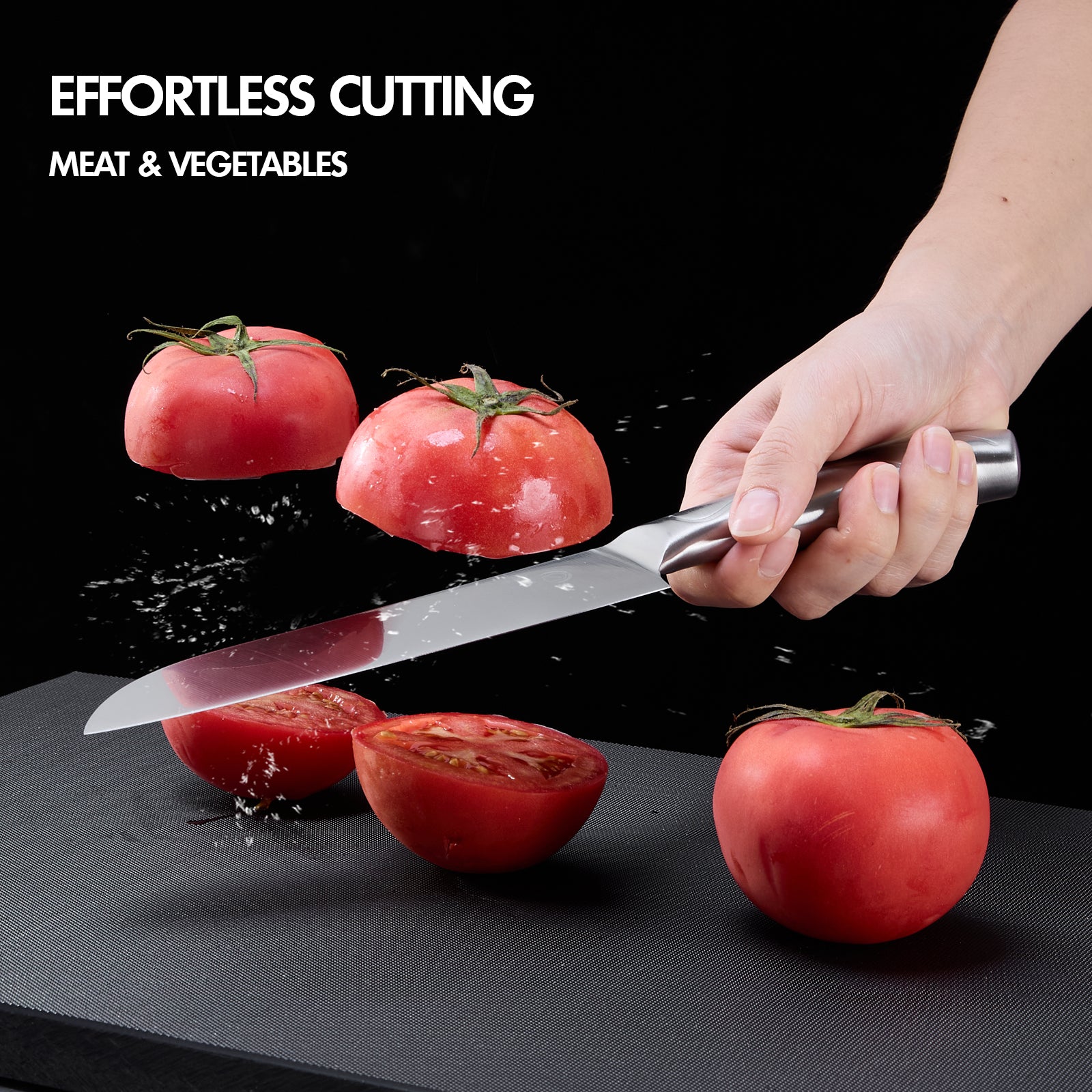- 【Ergonomic Handle】Ergonomically designed stainless steel handle is anti-slip and anti-freezing and firm to grip avoiding harms to your hand while using the knife.