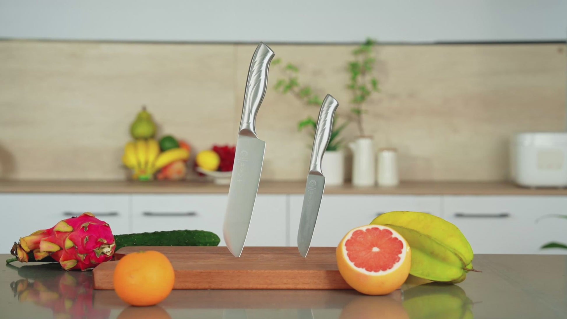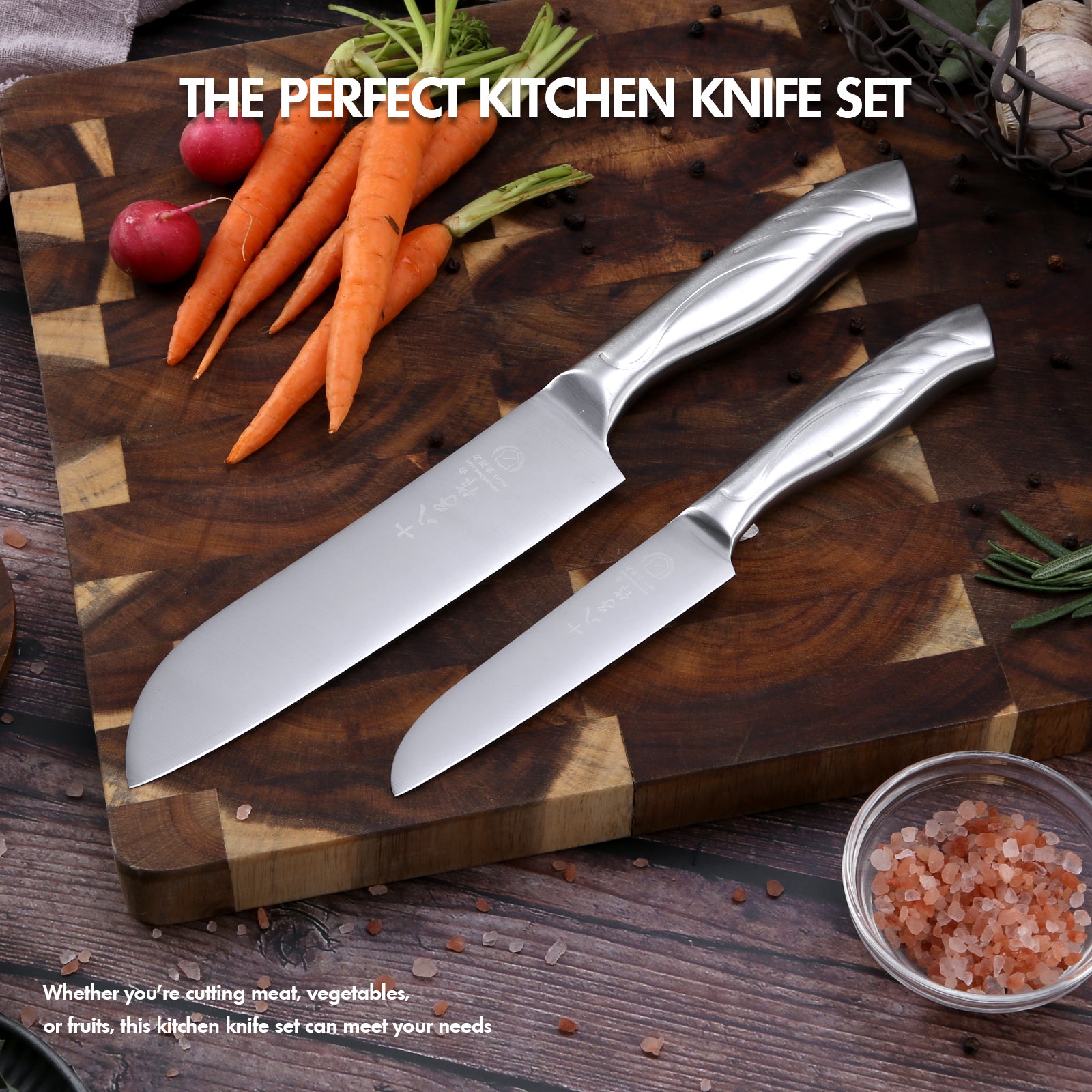 - 【Multifunctional knife set】This kitchen knife set includes 2 razor-sharp knives: a santoku knife and a fruit knife.Whether you're slicing meat,vegetables,dicing herbs,or prepping fruits, each kitchen knife of this set is designed to handle a variety of tasks effortlessly. Perfect for both professional chefs and home cooking enthusiasts.